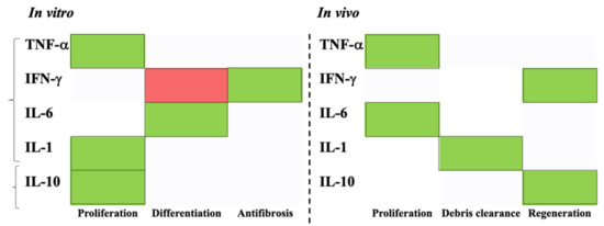 Schematic representation of cytokines contribution documented in both in vitro and in vivo studies (green box: promotion; red box: inhibition). Pro-inflammatory and anti-inflammatory cytokines showed an important contribution during skeletal muscle regeneration: in vitro, they mainly activated myoblasts proliferation and differentiation (except for INF-γ); in vivo, cytokines expression, promoted tissue clearance and its regeneration. Abbreviations: TNF-α, Tumor Necrosis factor-α, IFN-γ, Interferon-γ, IL, Interleukin.