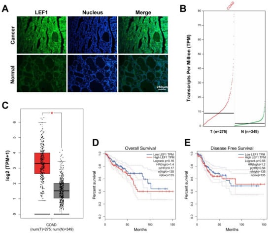 2.1. LEF1 Was Excessively Expressed in Colonic Adenocarcinoma Tissues and Enhanced Colonic Adenocarcinoma Progression