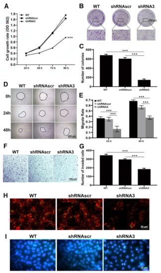 2.3. Downregulation of LEF1 Inhibited Cell Proliferation and Motility and Induced Apoptosis