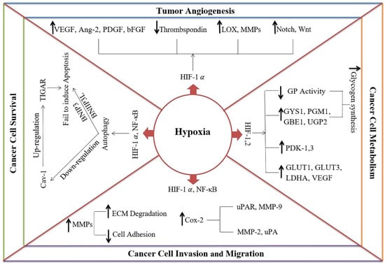 Hypoxia up-regulates growth factors and cellular adaptation genes by increasing the levels of HIF proteins which have a significant impact on cancer progression []. Interestingly, mutations that cause either oncogene activation or tumor suppressor inactivation can increase HIF-1α expression in cancer cells []. Hypoxia positively induces survival, invasion, migration, metabolism, and angiogenesis in cancer cells, as discussed below (summarized in Figure 1).