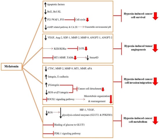 Melatonin (N-acetyl-5-methoxytryptamine), a multifunctional molecule, is produced in and released from the pineal gland and likely synthesized in the mitochondria of all other cells, where it is used locally and not released into the blood []. Many functions have been reported for melatonin, including the regulation of circadian rhythms and annual cycles of reproduction, antioxidant actions, and immune system regulation [,]. Additionally, melatonin has multiple anti-cancer properties such as anti-proliferation, anti-angiogenesis, immune system modulation, and apoptotic activities [,,,]. More interestingly, studies have demonstrated that melatonin modulated hypoxia-induced tumorigenesis [,,], and co-administration of melatonin in combination with other therapeutic compounds increased the effectiveness of those treatments [,,]. This review aims to describe the pathways involved in hypoxia-induced cancer development and more importantly explain how melatonin can possibly inhibit hypoxia-mediated tumor progression. Moreover, the current study provides possible mechanisms involved in the inhibition of hypoxia-induced tumor progression by melatonin.