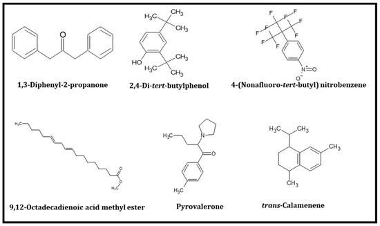 Chukeatirote et al. (2017) [22] identified 67 volatile compounds from non-fermented and fermented soybean products cultured with B. subtilis. Among them, 35 volatiles were identified only in fermented soybean products, including seven alcohols, five aldehydes, one aromatic, five ketones, nine acids and esters, four pyrazines, and four miscellaneous compounds (Table 1). Thirty-five compounds were selected for further analysis and screening by conducting in vitro and in silico studies. Molecular docking studies of 35 volatiles were performed to investigate their binding status to the active site of 10 distinctive proteins, namely PPARα (1K7L), PPARβ (1GWX), PPARγ (3DZY), AMPK(2Y94), LKB1(2WTK), PAR2 (modelled), SIRT1(4I5I,) SIRT2(5YQL), SIRT3 (4BN5), and SIRT6 (3K35). A total of 35 compounds were tested for distinctive proteins, while six compounds with a lower docking score (Table 2, Table 3 and Table 4), and high-affinity binding were found. The six compounds were 1,3-diphenyl-2-propanone, 2.4-di-tert-butylphenol, 4-(nonafluoro-tert-butyl)-nitrobenzene, 9,12-octadecadienoic acid methyl ester, pyrovalerone, and trans-calamenene. The chemical structures of these six volatiles are shown in Figure 1.