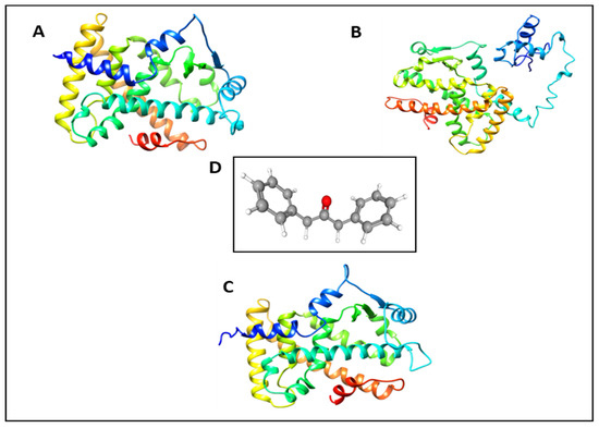 Crystalline structure of receptor (A) PPARγ-3DZY (B) PPARα-1k7l A (C) PPARβ-1GWX A http://rcsb.org (accessed on 27 September 2019) (D) Optimized structure of small compound 1,3-Diphenyl-2-propanone.