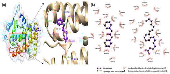 The binding interactions of the first active docked compliance of the ligands of the CGJ volatile compound and the target proteins were recognized using the Ligplot+ tool. We checked all amino acids inside the active site of the target protein, and important binding interactions were recognized. With regard to hydrogen bonding, electronic bonding, hydrophobic interactions, and van der Waals interactions also influenced the activity of ligands inhibiting the receptor [28]. The interaction of ligands with PPARα-eicosapentaenoic acid (control), PPARβ-GW501516 (control), and PPARγ-rosiglitazone (control) and that of DPP with the binding pocket receptor are shown in Figure 3A, Figure 4A and Figure 5A.