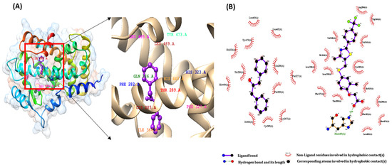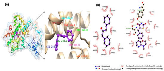 The abovementioned docking outcomes were observed on UCSF Chimera version 1.14 (RRID: SCR_004097). Only one compound (Table 13) was selected for the visualization among six compounds. The two-dimensional interactions of the complex protein-ligand structure, including the hydrogen bonds, hydrophobic interactions, and bond lengths, were analysed using LigPlot+ (RRID: SCR_018249) for high-affinity bonds.