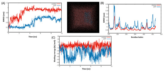 MD simulation analyses (A) root mean square deviation (RMSD) plot of PPARα-Eicosapentaenoic acid (control) and 1,3-Diphenyl-2-propanone (dpp) complex at10 ns of molecular dynamic simulation. (B) the RMSF plot of the back-bone heavy atoms of the Eicosapentaenoic acid (Red) and 1,3-Diphenyl-2-propanone (Blue) complex. (C) binding energy plot of Eicosapentaenoic acid (Red) and 1,3-Diphenyl-2-propanone (Blue) complex at10 ns.