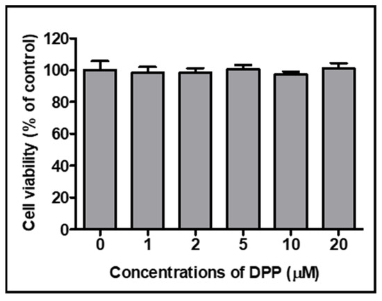 Cytotoxicity effect of DPP in Ac2F liver cells. Cells were cultured with the different concentrations of DPP (0–20 µM) for 24 h. Cell viability was assessed using the Ez-Cytox cell viability assay kit. Values are expressed as the mean ± SEM of three independent replications.