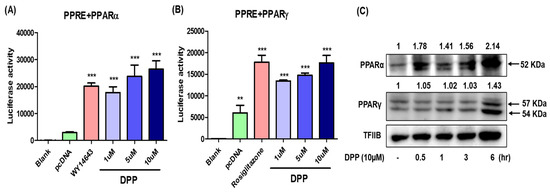 DPP increased transcriptional activity of PPARα and PPARγ. For luciferase, the 3× PPRE-TK-LUC plasmid and PPARα (A) or PPARγ (B) expression vector were transfected into Ac2F cells. Twenty-four hours after the transfection, the cells were treated with DPP or agonists (WY14643 10 µM and Rosiglitazone 10 µM, respectively) for 5 h. Values are expressed as the mean ± SEM of two independent replications. (C) The nuclear levels of PPARα and PPARγ in Ac2F cells were analysed by western blot and band intensity were quantified by ImageJ program. Transcription factor II B (TFIIB) was used as loading control. Statistical results of one-factor ANOVA followed by the Bonferroni test: ** p <0.05 and *** p < 0.001 vs. blank.