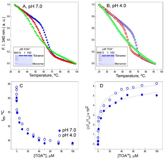 An assay based on the thermal denaturation of the KcsA protein was previously developed to study the binding of different channel ligands to KcsA, including permeant or nonpermeant cations, membrane lipids, and others [35,37,38,39,40]. Figure 1A,B shows examples of thermal denaturation curves to illustrate that the addition of TOA+ at micromolar concentrations to the detergent-solubilized channel leads to a concentration-dependent decrease in the thermal stability of the wild-type protein, both at pH 7.0 and pH 4.0. Because of the destabilizing effects of TOA+ on KcsA, these experiments were always conducted at a constant 10-mM concentration of Na+ to ensure that the tetrameric channel does not dissociate into monomers at the different TOA+ concentrations tested (Figure 1A,B insets).
