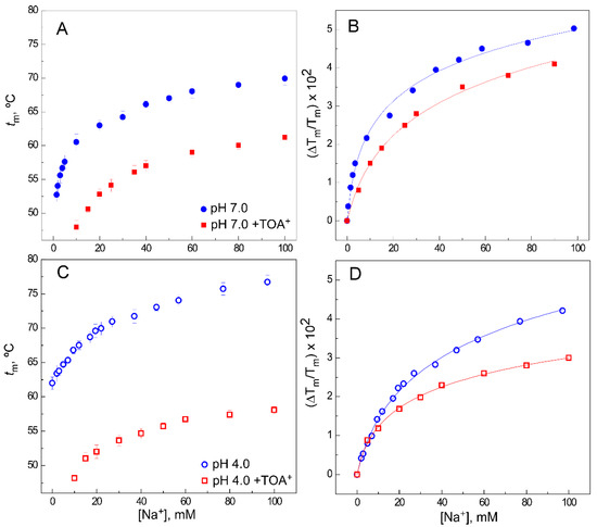 Effect of TOA+ on Na+ binding to WT KcsA. Panels (A,C) illustrate Na+ binding to the WT KcsA channel at pH 7.0 (panel (A)) or pH 4.0 (panel (C)), in the absence (circles) and presence (squares) of 100 µM TOA+, monitored through the Na+-concentration-dependence of the midpoint temperature of the protein denaturation process (tm). Each experimental point is the average tm (in Celsius) ± S.D. (n = 3). Panels (B,D) show the fitting of Equation (1) to the experimental data from panels (A,C), respectively (see Methods). The apparent KD values estimated for the above binding events are given in Table 1.