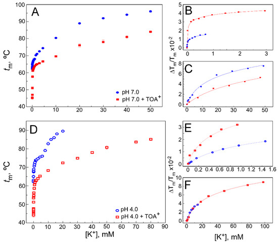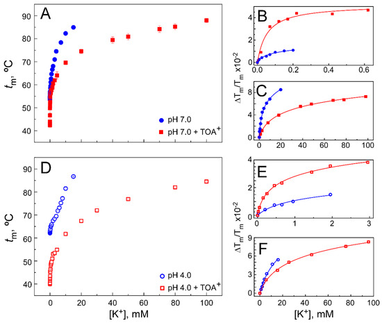 Effect of TOA+ on K+ binding to W67 KcsA. Panels (A,D) illustrate K+ binding to the W67 KcsA channel in the absence (circles) and presence of 100 µM TOA+ (squares) at pH 7.0 (panel (A)) or pH 4.0 (panel (D)), monitored through the K+-concentration-dependence of the midpoint temperature of the protein denaturation process (tm). Each experimental point is the average tm (in Celsius) ± S.D. (n = 3). As to the WT KcsA from Figure 3, when the low (panels (B,E)) and high (panels (C,F)) K+ concentration ranges are analyzed separately, Equation (1) adequately fits the data from panels (A,D), which is evidence that the two different sets of K+ binding sites are present in W67 KcsA. The apparent KD values estimated for the above binding events are given in Table 1.