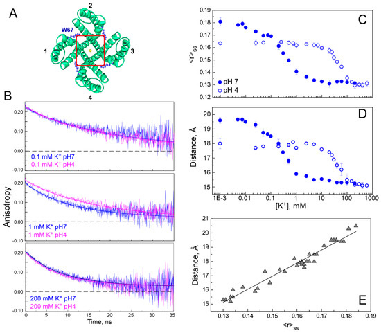Interestingly, at both pH conditions, the K+-dependent changes in the steady-state anisotropy values and the W67–W67 intersubunit distances calculated from the time-resolved anisotropy decays (Figure 4C,D) show an excellent linear correlation. Therefore, the intersubunit distance for a given experimental condition can be easily estimated by simply interpolating the steady-state anisotropy value in the correlation curve shown in Figure 4E. Such a correlation curve was built with the data presented in this work, as well as data previously determined for saturating concentrations of different cations [34].