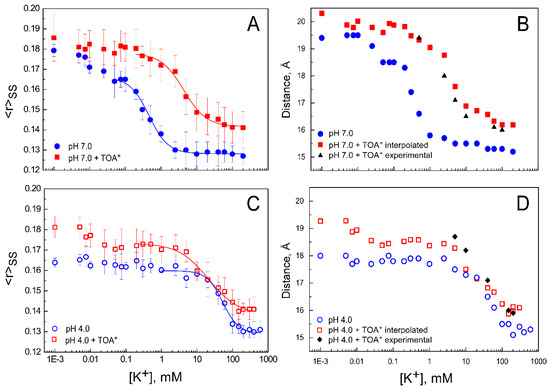 As to the effects of TOA+ on the affinity of K+ to bind to the SF, the titration curves in Figure 6A,B show that at pH 7.0, the sigmoidal decrease in <r>SS or in the intersubunit distance in the TOA+-containing samples occurs at higher K+ concentrations than in its absence. This attests to a TOA+-induced loss in the affinity of the SF to bind K+. Again, this is not as noticeable in the samples at pH 4.0, in which the channel is already inactivated.