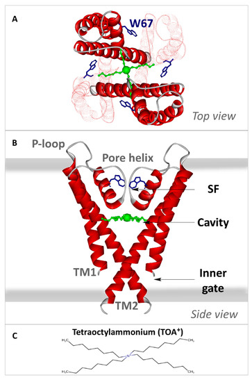 Transmembrane portion of KcsA. Crystallographic structure of the C-terminal truncated KcsA in the closed state with TOA+ (green balls and sticks, with a larger ball representing the quaternary nitrogen) bound at the cavity (PDB: 2W0F). In the top view (panel (A)), two of the four subunits appear faintly drawn to facilitate the observation. The four W67 residues are depicted as blue sticks. In the side view (panel (B)), only two of the four monomers have been drawn as a solid red ribbon for the sake of clarity. Each monomer consists of two transmembrane helices (TM1 and TM2) connected by the P-loop region, a short, tilted pore helix, and the selectivity filter (SF). The thick grey lines indicate the membrane limits. Both views illustrate how the TOA+ alkyl chains traverse the TM2 helix. Panel (C) represents the tetraoctylammonium ion in perspective.