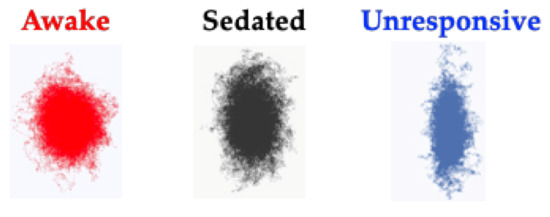 As signals slow and the brain oscillations take on more redundant and repetitive patterns, an additional way to quantify changes in the EEG signal is by calculating its complexity. A common method to calculate complexity comes from a nonlinear dynamic technique to extract dynamical attractors from the EEG signals. Here, a single EEG channel can be used to generate an attractor. An attractor is created by plotting EEG signal amplitudes at different time delays, each on a different axis. Interestingly, when this is done with electrophysiological signals from different anesthetic depths, shape changes occur [25,26]. Specifically, three dimensional attractors derived from electrophysiological signals change from inflated spheres during awake states, to flattened ellipsoids as individuals are sedated, and flatten even more during periods of unresponsiveness. Figure 2 shows these changes from extracellular local field potentials from rodent prefrontal cortex during awake (red), sedated (black), and unresponsive (blue) states. Unresponsiveness was assessed using the loss of righting reflex, a surrogate measure for loss of responsiveness in rodents [27].