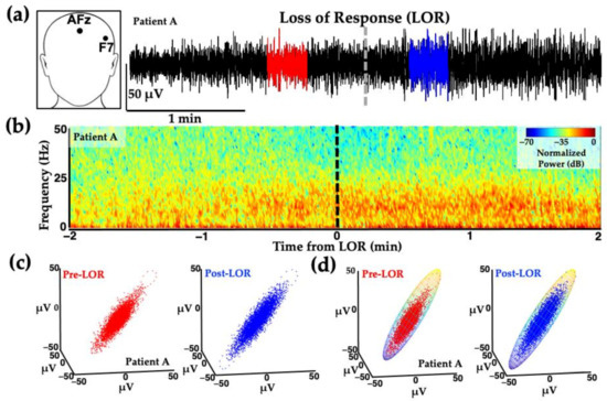 Example of patient EEG frontotemporal activity from before and after loss of response from remifentanil and nitrous oxide anesthesia. (a) EEG activity from electrode location At1 (inset) before and after loss of response (LOR, indicated with the dashed line) in patient anesthetized with a combination of remifentanil and 66% nitrous oxide (N2O). (b) Normalized spectrogram of EEG activity starting from 2 min before LOR to 2 min following LOR. (c) Attractors from 20 s EEG activity from patients before LOR (red, from red line shown in (a)) to after LOR (blue, from blue line shown in (b)) fitted with ellipsoid solid of revolution. Following LOR, a geometric shape change occurs where attractors become more ellipsoidal and flatten. (d) Same attractors from (c), auto-scaled to show geometric shape changes. Reproduced here with permission from Reference [5].