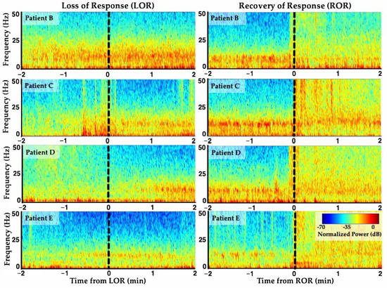 On average, when GABAergic agents are administered, there is a loss in high frequency activity, increase in low frequency activity, and higher alpha-band activity following LOR (Figure 5, left). The opposite trend occurs upon recovery of response (ROR) (Figure 5, right). These results are aligned with previous reports of propofol loss and recovery dynamics from frontal lobe sites [8,23]. Note that individual patients can have varying electrophysiological response dynamics around LOR and ROR given their individual dynamic responses to the anesthetic agents (Figure 5). Differences in response dynamics may occur because of the molecular binding dynamics of diverse agents or between individuals themselves [29,30].