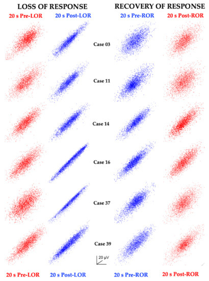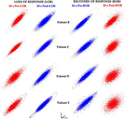 EEG attractors consistently demonstrate shape changes with changes in responsiveness. Attractors from 20 s EEG clips from four patients (the same patients as shown in Figure 5) before and after LOR and ROR when anesthetized with propofol. Awake, responsive states are shown in red, and anesthetized, unresponsive states are shown in blue. Attractors from awake, responsive states are more spherical; whereas attractors from anesthetized, unresponsive states are more ellipsoidal. Attractors are auto-scaled to illustrate the shape changes that occur with LOR and ROR. The axes are shown to demonstrate that these are 2D projections of 3D attractors. Reproduced with permission from Reference [7].