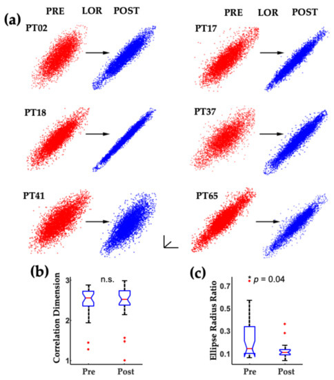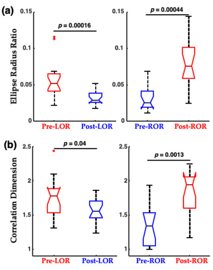 When this shape change was quantified using a traditional nonlinear dynamic measure, correlation dimension (CD), and using a geometric phase–space analysis, termed the ellipse radius ratio (ERR), significant differences were observed between before and after the LOR and ROR states (Figure 7). Correlation dimension is a nonlinear dynamic technique to compute the non-integer (fractal) dimensionality of irregular objects [31,32]. For the geometric phase–space analysis, the 3D attractor was fitted with an ellipsoid solid of revolution [33], and then the ratio of the minor and major axes were computed [5,6,7]. Ratios closer to 1 occurred with more spheroidal attractors, and smaller fractions occurred with more ellipsoidal attractors. We have demonstrated that this geometric phase–space analysis is correlated with other complexity measures [6,7].