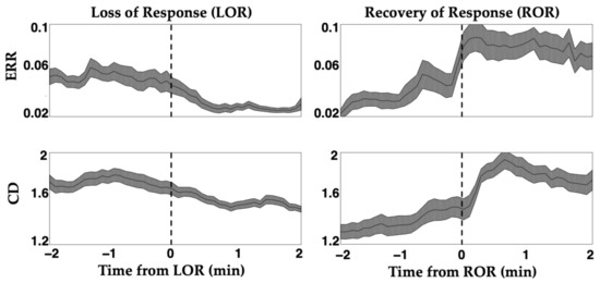 Attractor measures exhibit differing dynamics around loss and recovery of response. Induction of anesthesia and emergence from anesthesia produces an asymmetrical dynamic, known as hysteresis. Complexity measures, both the ellipse radius ratio (ERR) and the correlation dimension (CD), track these different dynamics at loss of response (LOR) and recovery of response (ROR). LOR and ROR timepoint areas are indicated with dashed lines. Dynamics are more gradual during LOR and more abrupt during ROR. Differences in dynamics observed here support existing paradigms that these brain state transitions are unique. Solid black lines represent the mean complexity values at each time point for all patients, and the shaded area is the standard error of the mean. Adapted with permission from Reference [7].
