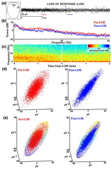 Example of geriatric patient EEG frontal activity from before and after loss of response with fentanyl and propofol. (a) EEG activity from electrode location F7 (inset) before (red line) and after (blue line) loss of response (LOR) in geriatric patient anesthetized with a combination of fentanyl and propofol. (b) Spectrum from 20 s EEG clip from before (red) and after (blue) LOR. (c) Normalized spectrogram of EEG activity starting from 2 min before LOR to 2 min following LOR. For both (b) and (c), it is difficult to see the spectral differences between before and after LOR, given the overall loss in power in the EEG signal commonly observed in geriatric patients. (d) Attractors from 20 s EEG clips from patients before LOR (red) to after LOR (blue). Following LOR, the same geometric shape change occurs where attractors become more ellipsoidal and flatten, as shown in previous examples. (e) Same attractors from (c), fitted with ellipsoid solid of revolution which was used for subsequent analysis. Reproduced with permission from Reference [6].