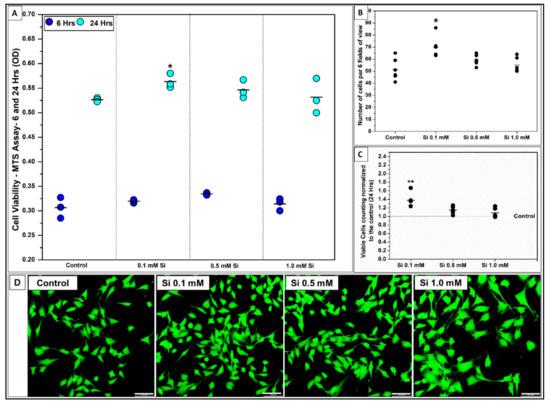 Effect of silicon ions on C2C12 myoblast cell viability. (A) Data distribution graph present the cell viability results using MTS-assay after 6 and 24 h of C2C12 cell culturing in growth media with three different concentration of Si4+ (0.1, 0.5, and 1.0 mM). 0.1 mM of Si4+ into the growth media significantly increases the cell viability after 24 h compared to the control (* p < 0.05, n = 3 per group). (B) Data distribution graph presents the number of cells per 6 fields of view confirming that 0.1 mM of Si4+ significantly increase the number of cells after 24 h. (C) Bar graph shows the number of viable cells normalized to the control after 24 h, (** p < 0.01). (D) Fluorescent pictures (20× view) of C2C12 cells stained with live/dead assay kit shows enhancement on cell viability after being exposed to ionic silicon. (—) in the graphs represents the mean and the scale bar in the fluorescent pictures is 100 µm.