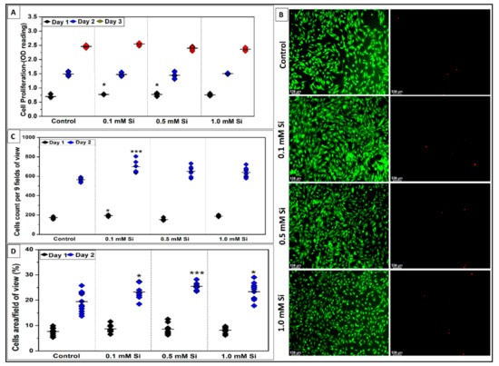 Effect of Si-ions concentration on C2C12 cells proliferation for 3 days. (A) Data distribution graph shows the MTS-assay results of C2C12 cell proliferation with 3 different concentration of silicon ions for 1, 2, and 3 days. 0.1 mM Si significantly increased the number of cells at day 1 and 3, (* p < 0.05). (B) Fluorescent pictures (10× view) of C2C12 cells stained with live/dead assay kit shows the live (green) and dead (red) cells after 2 days of proliferation. Almost no dead cells were observed for the control and silicon ions groups. (C) Data distribution graph presents the number of cells per 9 fields of view counted from the fluorescent pictures. The cell counts confirmed that 0.1, 0.5, and 1.0 mM Si-ions significantly increased the total number of cells by day 2 of proliferation. (D) Cell area percentage confirmed that Si-ions significantly increased the area covered by C2C12. (—) in the graphs represents the mean and the scale bar on the pictures is 100 µm, (*** p < 0.001, n = 3 per group).