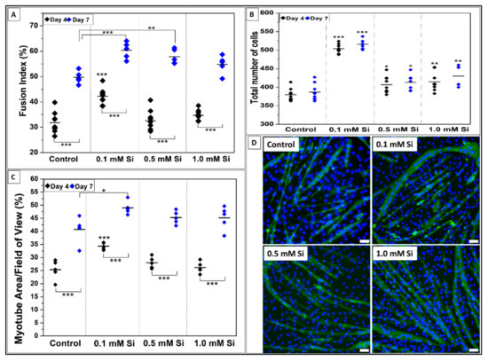 To determine the effect of Si-ions on myogenic differentiation, C2C12 cells were cultured with three different concentrations of Si-ions for 4 and 7 days. After each timepoint, the mature myocytes/myotubes were stained with MHC antibody and DAPI counterstain as shown in Figure 3. FI calculations indicated that 0.1 mM Si-ions significantly increased myotube formation compared to the control with FI (%) = 42 ± 3.3 and 31 ± 4 at day 4 and FI = 60 ± 3.2 and 50 ± 2.4, respectively, at day 7 (*** p < 0.001) as shown in Figure 3A. Additionally, 0.5 mM and 1.0 mM Si-ions significantly increased the FI compared to the control at day 7, (** p < 0.01 and * p < 0.05, respectively). Overall, FI was significantly increased from day 4 to day 7 for all samples including the control (*** p < 0.001). Total number of cells counted from 9 FOVs of DAPI stained nuclei indicated that all Si concentrations significantly increased the total number of cells at day 4 compared to the control with optimal concentration of 0.1 mM Si-ions, *** p < 0.001 (Figure 3B). Furthermore, area covered by myotubes was calculated based on MHC staining at 4 and 7 days. The calculated myotubes area (%) indicated that all Si concentrations increased the total area of myotubes per FOV compared to the control, however, only 0.1 mM Si-ions presented a significant difference at day 4 (34.3 ± 1.2%) and day 7 (48.9± 2.4%) when compared to the control (25.3 ± 3.6% and 40.6 ± 4.8% for day 4 and 7, respectively) as shown in Figure 3C. It is important to mention that there was no significant difference between the total number of cells from day 4 to 7, while the FI and the myotube area % significantly increased from day 4 to day 7 for all groups including the control.