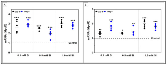 Expression of two key regulatory genes of myogenesis related to C2C12 myoblast differentiation were detected using qRT-PCR analysis following 1 and 5 days of differentiation. MyoG is an important myogenic regulatory factor expressed to mark cell commitment to differentiation [21]. MyoD is a vital gene for myoblast progression during differentiation to form skeletal muscles [22]. Figure 4 shows relative mRNA expression of MyoG and MyoD following 1 and 5 days of differentiation. Figure 4B presents the mRNA expression of MyoG at day 1 and 5 of C2C12 differentiation. All Si-ion concentrations significantly increased MyoG expression compared to control at day 1 and 5. Following day 1 of differentiation MyoG expression increased ~1.3-fold in both 0.1 mM and 0.5 mM Si-ion groups (** p < 0.01, * p < 0.05, respectively) then further increased following 5 days of differentiation to ~1.8-fold difference for 0.1 mM Si-ions and ~1.5-fold difference for 0.5 mM Si-ions (*** p < 0.001, ** p < 0.01, respectively) compared to control. For the high concentration 1.0 mM Si-ion group, there was a significant increase by ~2-fold in MyoG expression at day 1 which decreased to a ~1.8-fold difference compared to the control by day 5 of differentiation (*** p < 0.001). The qRT-PCR results indicated that MyoD expression was significantly increased in 0.1, 0.5 and 1.0 mM of Si-ion samples following 1 and 5 days of C2C12 myoblast differentiation as shown in Figure 4A (*** p < 0.001). A 2.5-fold increase in MyoD expression for 0.1 mM Si-ion samples and a 3-fold increase in 1.0 mM Si-ion samples was observed compared to control at day 1. There was a 3-fold difference in MyoD expression in the 0.1 mM Si-ion group and only a 2.8-fold difference in the 1.0 mM Si-ion group following 5 days of differentiation. Finally, there was a 2.5-fold increase in MyoD expression in the 0.5 mM Si-ion group following 1 day of differentiation that decreased to a 2-fold difference by day 5.