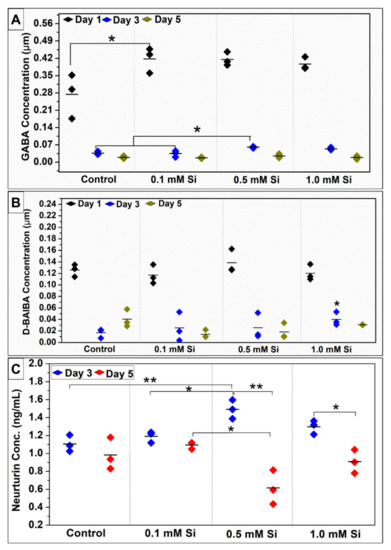 Effect of Silicon-ions on ϒ-aminobutyric acid (GABA), D-Beta aminoisobutyric acid (D-BAIBA) concentration in µM, and Neurturin (ng/mL) expressed by C2C12 during 5 days of differentiation. (A) GABA concentration increased by adding Si-ions to the differentiation media. (B) The concentration of D-BAIBA increased by adding 0.5 mM of Si to the differentiation media at day 1, but no significant difference was observed compared to the control. (C) Neurturin expression in media (ng/mL) during C2C12 myoblast cell differentiation for 3 and 5 days. All silicon-ion concentrations increased the neurturin expression, but the 0.5 mM of silicon-ions significantly increased the neurturin expression compared to the control at day 3 of differentiation (*p < 0.05 and ** p < 0.01).