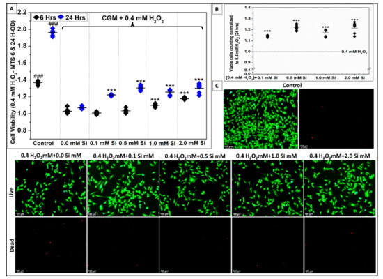 Based on the above cell viability experiment under ROS conditions, a concentration of 0.4 mM H2O2 was used to study the effect of Si-ions on C2C12 cell viability under toxic oxidative stress. This experiment was performed to determine the optimal Si-ions concentration for preserving C2C12 cells under toxic oxidative stress. 2.5 × 104 cells/well were seeded in a 24-well plate and provided with 500 µL of specified media for each group (n = 3). GM was used as the positive control, GM + 0.4 mM H2O2 was used as the negative control, and four different Si-ion concentrations were used as following: GM + 0.4 mM H2O2 + 0.1 mM Si, GM + 0.4 mM H2O2 + 0.5 mM Si, GM + 0.4 mM H2O2 + 1.0 mM Si, and GM + 0.4 mM H2O2 + 2.0 mM Si. All plates were incubated for 6 and 24 h. After each time point MTS and live/dead assays were performed as previously mentioned. Fluorescence images (10× FOV) of stained C2C12 cells were taken to observe the cells after exposure to H2O2 and H2O2 + Si for 6 and 24 h.