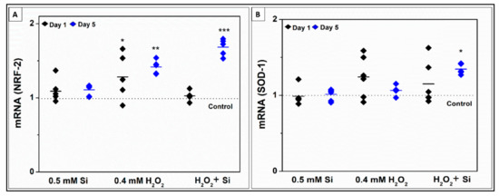 To determine the effects of Si-ions on antioxidant activity in the presence of toxic oxidative stress, C2C12 cells were differentiated in media containing 0.5 mM Si-ions only, 0.4 mM H2O2 only, 0.5 mM Si + 0.4 mM H2O2, and no treatment group as a control. After 1 and 5 days of differentiation, real time qRT-PCR was used to quantify the relative concentrations of NRF-2 and SOD-1 mRNA in all 4 groups (Figure 9). At normal condition, Si treatment did not show any significant effect on NRF-2 or SOD-1 expression compared to the control, while 0.4 mM H2O2 has increased the SOD-1 and NRF-2 expression with a significant increase only in NRF-2 expression at day 1 and 5 (Figure 9A). For the combined group (0.5 mM Si + 0.4 mM H2O2), there was a significant increase in NRF-2 (1.7 ± 0.1, p = 0.00002) and SOD-1 (1.35 ± 0.06, p = 0.04) at day 5 compared to the control.