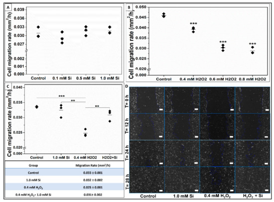 Scratch-wound healing assay was performed to compare cell migration parameters under different conditions. It is commonly used to measure cells’ migration parameters such as speed, persistence, and polarity [54]. In this study, we compared myoblast cells’ migration rate, referred to as the wound healing rate, under four different conditions: 0.1–1.0 mM Si-ions, 0.4–0.8 mM H2O2, 0.4 mM H2O2 + 1.0 mM Si-ions, and the control as shown in Figure 10. The cells’ migration rate under Si-ions compared to the control is shown in Figure 10A. It is noted that 0.5–1.0 mM Si-ions slightly increased the migration rate, but no significant difference was observed. Figure 10B shows the migration rate under three toxic H2O2 concentrations (0.4, 0.6, and 0.8 mM). All used H2O2 concentrations significantly decreased the migration rate (*** p < 0.001) compared to the control group as shown in Figure 10B. Addition of 1.0 mM Si-ions to the 0.4 mM H2O2 conditioned media attenuated the toxic effect of H2O2 and significantly increased the cells’ migration rate compared to the non-Si-ions treatment (** p < 0.01) as shown in Figure 10C. Furthermore, no significant difference was observed between the control group (rate = 0.033 ± 0.001 mm2/h) and the H2O2 + Si group (rate = 0.031 ± 0.002 mm2/h), while the H2O2 alone presented a significant decrease in the migration rate (rate = 0.025 ± 0.001 mm2/h) compared to the control (*** p < 0.001). Figure 10D shows the phase contrast images (10×, scale bar = 100 μm) of wound/scratch area at different time points (0, 12, 24, and 28 h). Migration rate of each group is reported in the inserted table in Figure 10.