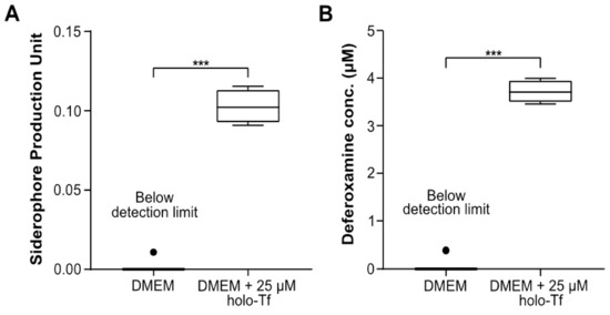 Having established the ability of AMB-1 to proliferate in DMEM, we next determined to what extent AMB-1 produce siderophores in DMEM. Using the Chrome Azurol S (CAS) assay (Figure S2), 108 AMB-1 bacteria were found to produce 0.10 ± 0.005 siderophore units in DMEM supplemented with 25 µM holo-transferrin (holo-Tf), while siderophore production in transferrin-free DMEM was negligible (Figure 1A). AMB-1 siderophore production was compared to the widely used iron chelator deferoxamine. It was found that the siderophores produced by 108 AMB-1 in Tf-supplemented media were equivalent to 3.78 µM ± 0.117 µM deferoxamine (Figure 1B). These experiments demonstrated that AMB-1 could survive and proliferate at 37 °C and that the bacteria could produce a quantifiable amount of siderophores when holo-Tf was supplemented to the mammalian cell culture media.