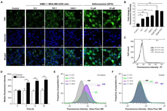To gain insights on the TfR1 expression kinetics of the cell population, AMB-1-induced increase of cell surface TfR1 expression was analyzed over time. The effect at an AMB-1: MDA-MB-435S ratio of 1000:1 was already apparent after 6 h of co-culture (Figure 2D). The fluorescence intensity after 24 h of co-culture was 1.8 times higher than the initial value, while the change reached 95% of the final value after 12 h (Figure 2E). Untreated cancer cells did not display any increase in fluorescence (Figure 2F).