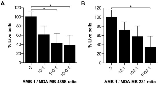 Investigation of cell growth upon incubation with AMB-1 bacteria. Cell viability of (A) MDA-MB-435S and (B) MDA-MB-231 was determined using an MTT assay and expressed as a percentage of the untreated cells. Viability (%) is expressed as mean ± SD of 3 individual biological replicates. Ordinary one-way ANOVA test was used to assess statistical significance (* p-value < 0.05).