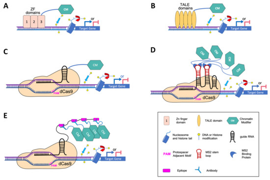 - Brocken, D.J.; Tark-Dame, M.; Dame, R.T. dCas9: A Versatile Tool for Epigenome Editing. Curr. Issues Mol. Biol. 2018, 26, 15–32. [Google Scholar] [CrossRef]