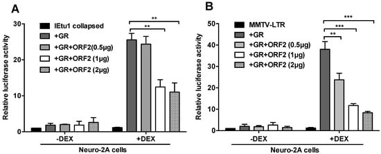 The effects of the ORF2 construct on the mouse mammary tumor virus (MMTV) long terminal repeat (LTR) was also examined because this promoter is strongly stimulated by GR+DEX due to multiple GREs in the LTR [,]. The ORF2 expression plasmid significantly reduced GR-mediated transactivation of the MMTV LTR in Neuro-2A cells (Figure 1B). With respect to both IEtu1 collapsed and MMTV LTR promoters, the ORF2 expression construct reduced GR+DEX mediated transcription in a dose-dependent effect.