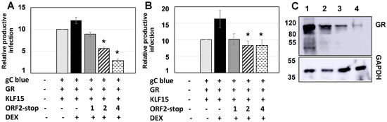 Latency-related (LR) ORF2 RNA sequences interfere with productive infection and reduce GR steady-state protein levels. Panel (A): Neuro-2A cells were transfected with 1.5 ug BHV-1 gC-Blue, and where indicated, a plasmid-expressing mouse GR protein (1.0 ug DNA), Krüppel-like transcription factor 15 (KLF15) (0.5 ug DNA), and ORF2-Stop (1, 2, or 4 ug plasmid). To maintain the same amount of DNA in each sample, an empty vector was included in samples. After transfection, 2% stripped FBS was added to media. Then, designated cultures were treated with water-soluble DEX (10 uM; Sigma; St. Louis, MO, USA). At 48 h after transfection, the number of β-Gal+ Neuro-2A cells was counted from four independent quadrants/plate. Panel (B): Rabbit skin (RS) cells were transfected with the designated plasmids as described in Panel A. At 24 h after transfection, the number of β-Gal+ RS cells was counted from four independent quadrants/plate. Twenty-four hours was used for RS cells because at later times after transfection, virus shedding occurs in the initial transfected cell and spread to surrounding cells, which culminates in disruption of the monolayer due to productive infection. For Panels A and B, the results are the average of three independent experiments. The value for the control (gC-Blue virus cotransfected with empty vector and then treated with PBS after transfection) was set at 1. An asterisk indicates a significant difference between control and samples transfected with the GR and/or KLF15 and treated with DEX (p < 0.05) using the Student t-test. Panel (C): Neuro-2A cells were cotransfected with the GR expression construct (1.0 ug DNA; lane 1) and 1 (lane 2), 2 (lane 3), or 4 (lane 4) ug of the ORF2-Stop plasmid (ug DNA). To maintain the same amount of DNA in each sample, an empty vector was included in certain samples. Cells were incubated with 2% stripped FBS 24 h after transfection, and cultures were treated with DEX (10 μM) until 48 h after transfection. Then, WCL was prepared, and Western blots were performed to measure GR: 10 ug WCL was used for each lane. Position of molecular weight markers are shown.