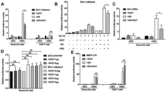 S33Y expression reduced GR-mediated transactivation of the IEtu1 promoter. Panel (A–C): Neuro-2A cells or COS-7 cells were cotransfected with the IEtu1 collapsed promoter construct containing the firefly luciferase reporter gene (0.5 μg) and where indicated plasmids that express GR (1.0 μg) or S33Y (1.0 μg). Where denoted, KLF15 (0.5 μg) and/or S33Y (1.0 μg). Panel (D): The empty pGL3-Promoter vector (0.5 μg) or IEtu1 promoter (0.5 μg) was cotransfected with a plasmid expressing the denoted concentration of S33Y. Panel (E): Neuro-2A or COS-7 cells were transfected with the MMTV-LTR promoter construct (0.5 μg), which is a plasmid that expresses GR (1.0 μg) and/or S33Y plasmid (1.0 μg). A plasmid that expresses Renilla luciferase (0.05 μg) was included in all transfections. To maintain the same amount of DNA in each sample, an empty vector was included in certain samples. Cells were incubated with 2% stripped FBS 24 h after transfection and, where indicated, cultures treated with DEX (10 μM). Dual-luciferase assay was performed as described in the Materials and Methods. The results are the average of three independent experiments, and error bars denote standard error. Student’s T-test was used for statistical analysis: not significant (ns); *, p < 0.05; ***, p < 0.001.
