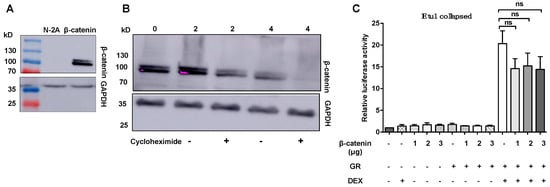Wt β-catenin is unstable in Neuro-2A cells and does not interfere with GR-mediated transactivation of the IEtu1 promoter. Panel (A): Neuro-2A cells were transfected with a plasmid that expresses wt β-catenin (2.0 μg) or mock-transfected. Twenty-four hours after transfection, WCL was prepared and Western blots were performed using a β-catenin or GAPDH-specific antibody. Each lane contained 10 μg of protein WCL. Panel (B): Neuro-2A cells were transfected with wt β-catenin (2.0 μg). Twenty-four hours after transfection (denoted as 0), cultures were treated with cycloheximide denoted with a + symbol (100 μg/mL) for 2 h and 4 h to inhibit protein synthesis. Neuro-2A cells were lysed and processed for Western blot analysis to detect β-catenin or GAPDH. Molecular weight markers and the size of bands are denoted for Panel (A,B). Panel (C): Neuro-2A cells were transfected with IEtu1 collapsed promoter construct (0.5 μg), plasmid that expresses GR (1.0 μg), or wt β-catenin (1.0, 2.0, or 3.0 μg) and a plasmid expressing Renilla luciferase (0.05 μg). Empty vector plasmid was added to certain samples to maintain the same amount of DNA in each transfection. Neuro-2A cells were incubated with 2% stripped FBS, and 24 h following transfection, the designated cultures were treated with DEX (10 μM). At 48 h after transfection, cells were harvested, and protein lysate was subjected to a dual-luciferase assay. The results are the mean from three independent experiments. Statistical analysis was performed with the Student’s T-test: not significant (ns).