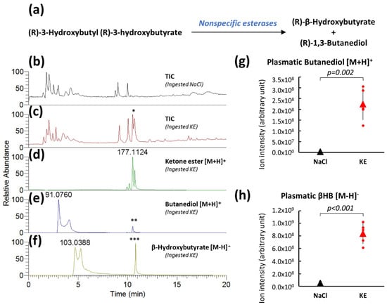 Plasma analyses after KE ingestion. Plasma β-hydroxybutyrate (βHB)and 1,3-butanediol levels (a). Total ion LC-MS chromatograms (TIC) acquired in positive spectrometry mode of plasma samples from 0.9% NaCl-gavaged control mice (b) from KE-gavaged mice (3 mg KE/g of body weight) (c) (* KE peak on the TIC chromatogram). Extracted ion chromatograms of KE (d) and its metabolites butanediol (e) and β-hydroxybutyrate (f) from plasma of KE-gavaged mice (in electrospray ionization source produced butanediol from KE (**) and β-hydroxybutyrate from KE (***). Levels of KE metabolites (butanediol [M+H]+ (g) and β-hydroxybutyrate [M−H]− (h)) from the plasma of mice 30 min after NaCl or KE gavage (n = 5).