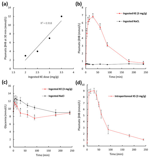 Plasma pharmacokinetics of β-hydroxybutyrate and glucose after KE ingestion. Plasma levels of βHB 30 min after intake of 2, 2.5, 3, and 3.5 mg ketone ester (KE)/g of body weight (a). Plasma βHB pharmacokinetics after intake of 3 mg KE/g of body weight or 0.9% NaCl (b) and glycemia with the same animals (n = 10) (c). Plasma βHB pharmacokinetics of mice after intraperitoneal injection of ketone sodium salt (3 mg KS/g of body weight) (n = 10) (d). * p < 0.05.