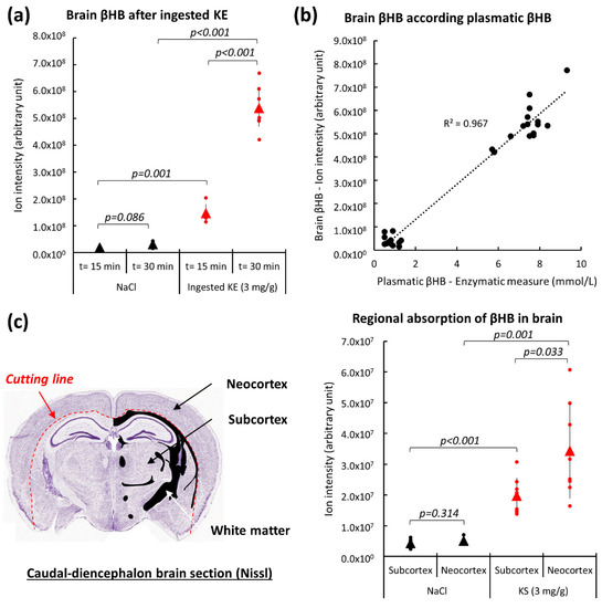 Brain βHB levels after KE ingestion. LC-MS analyses of brain βHB levels at 15 min and 30 min after intake of 3 mg KE/g of body weight and 0.9% NaCl (n = 10) (a). Brain βHB levels at different plasma βHB concentrations (n = 10) (b). Regional brain βHB levels 15 min after IP injection of 3 mg ketone salt/g of body weight (n = 8). LC-MS analyses were conducted on frozen sections after separation (red dotted line) of neocortex (grey matter) from the subcortex (grey and white matter) region using microdissection as specified on the cutting plane above (c).