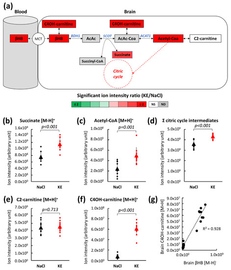 Brain metabolite levels of the βHB pathway after KE ingestion. Schematic representation of the brain βHB pathway indicating significant metabolic changes for the relevant intermediates by color code. Brain metabolite levels were assessed by LC-MS 30 min after the ingestion of KE (3 mg KE/g of body weight) or 0.9% NaCl (a). Individual LC-MS analysis of succinate (b), acetyl-CoA (c), total citric acid cycle intermediates (d), C2-carnitine (e), and C4OH-carnitine (f). Correlation between βHB and C4OH-carnitine in brain 30 min after the ingestion of KE (n = 10) (g). (ND: not detected; NS: not significant; MCT: monocarboxylate transporters; C4OH-carnitine: hydroxybutyrylcarnitine; AcAc: acetoacetate; AcAc-CoA: acetoacetyl-CoA; C2-carnitine: acetyl-carnitine; BDH1: β-hydroxybutyrate dehydrogenase 1; SCOT: succinyl-CoA:3-ketoacid CoA transferase; ACAT1: acetyl-CoA acetyltransferase or acetyl-CoA thiolase).