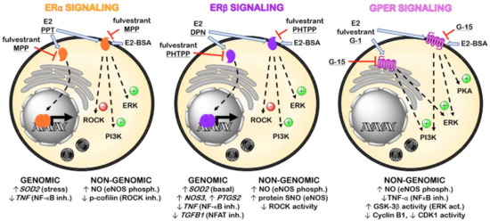 Representative scheme of the main pharmacological agents targeting ER and signaling pathways involved in the mechanism of action of their genomic and non-genomic effects. (Act., activation; Inh., inhibition; Phosph., phosphorylation. Underlined: ER subtype-selective agonists and antagonists).