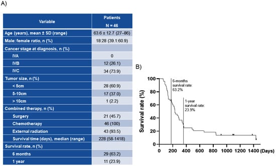 Information of ATC patients: (A) Patient characteristics and clinical features; (B) Survival rates of patients with anaplastic thyroid cancer. The cancer stage was determined according to the 8th edition of the AJCC/UICC by the American Joint Committee on Cancer and the International Union Against Cancer.