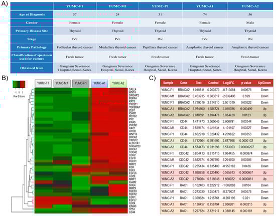 Various subtypes of patient-derived differentiated and undifferentiated thyroid cancer cell lines were acquired from the patient specimens (Figure 2A). YUMC-A1 (first isolated patient-derived ATC) and YUMC-A2 (second isolated patient-derived ATC) were obtained from patients with ATC treated at the Severance Hospital, Yonsei University College of Medicine, Seoul, Korea. Therapy failure, cancer recurrence, and metastasis were reported in these patients. The results of the next-generation RNA sequencing to identify a series of differentially expressed genes (DEGs) showed that YUMC-A1 and YUMC-A2, patient-derived ATC (undifferentiated) cells, were associated with significantly increased levels of cancer stemness (CD44high/CD24low, CDH2, KRAS CDC42, RAC1, MCPH1, SRGAP2, SRGAP2C, TWIST1, TWIST2, PROM1, ICAM1) and metastatic markers (BRACA1/2, KRT5, CD44, WNT4/16, ALDH1A1, CD29, SALL4) when compared with patient-derived differentiated thyroid cancer cells, YUMC-F1 (first isolated patient-derived follicular thyroid cancer), YUMC-M1 (first isolated patient-derived medullary thyroid cancer), and YUMC-P1 (first isolated patient-derived papillary thyroid cancer), as shown in Figure 2B,C. In ATC, the most significantly upregulated genes were BRACA2, CD44, CDC42, and RAC1. The top four upregulated and downregulated DEGs are shown in Figure 2C. Taken together, we concluded that study of the ATC could be of great value to therapeutic trials in the management of patients with stemness and metastatic cancer, including drug-resistant properties.