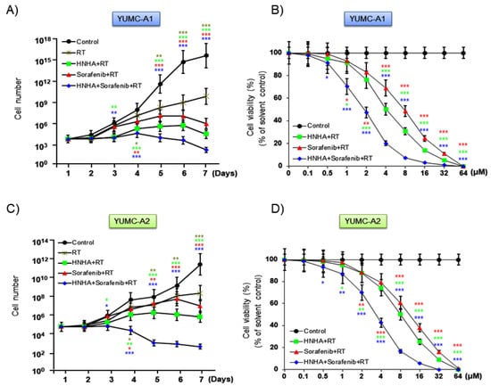 Synergistic anticancer effect of HNHA, sorafenib, and radiation on patient-derived thyroid cancer cells compared with the effects of each agent alone with radiation. Cell viability and proliferation assay of HNHA and sorafenib combined, each agent alone, or HNHA and sorafenib combined with radiation on patient-derived ATC cell lines. YUMC-A1 and YUMC-A2: (A,B) YUMC-A1 and (C,D) YUMC-A2,. Points indicate mean percentage of the value observed in the solvent-treated control. All experiments were repeated at least three times. Data represent means ± SD. * p < 0.05, ** p < 0.01, and *** p < 0.005 vs. control.