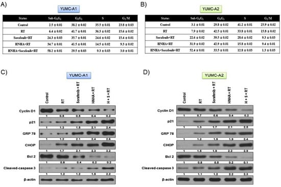 Next, we investigated the mechanism of the synergistic anticancer effects of the combination of HNHA, sorafenib, and radiation on YUMC-A1 and YUMC-A2 cell lines. We estimated the levels of expression of the markers of cell cycle (cyclin D1 and p21), ER stress (GRP 78 and CHOP), and apoptotic signaling pathways (Bcl 2 and cleaved caspase 3) on YUMC-A1 and YUMC-A2 by flow cytometry, immunoblot (whole cell lysate or cellular fractionation), and immunofluorescence analyses. The combination of HNHA and sorafenib with radiation significantly induced the sub-G0G1 population, resulting in the induction of apoptosis and cell cycle arrest in YUMC-A1 and YUMC-A2 cells (Figure 4A,B) and leading to ER stress-mediated apoptosis, cell cycle arrest, and strong inhibition of YUMC-A1 and YUMC-A2 (Figure 4C,D). Immunoblot analysis of the protein expression levels in YUMC-A1 and YUMC-A2 indicated that the combination of HNHA, sorafenib, and radiation induced the most marked increase in the levels of p21, GRP 78, CHOP, and cleaved caspase 3 (which are associated with cell cycle arrest and are ER stress and proapoptosis markers). In contrast, the combination treatment resulted in decrease in the levels of cyclin D1 and Bcl 2, which are positive regulators of cell cycle and anti-apoptotic, compared with responses to HNHA or sorafenib administration with radiation.